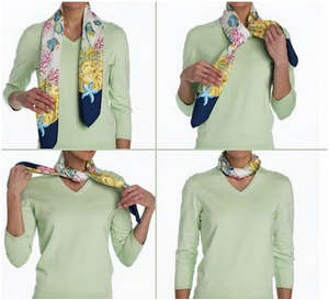 Для любого выреза также подойдет способ завязывания кольцом-жгутом. Сложив платок в полосу так, как указано в способе выше, положите платок вокруг шеи, при этом необходимо, чтобы один конец находился выше другого. Позже короткую часть положите под длинную и занесите ее в петельку, которая образовалась. Теперь каждую из сторон необходимо обернуть вокруг платка, а концы аккуратно уложите по кругу.