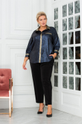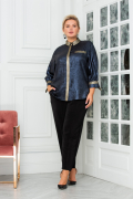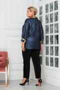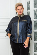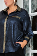 Роскошная блуза-рубашка, выполнена из легкой поливискозы с красивым мерцающим блеском. Модель прямого силуэта. Застежка на пуговицы, скрытые планкой. Объемные рукава длиной 3/4 украшены складками и манжетами на завязках. Линия плеча немного спущена. На груди накладной карман. Из ткани-компаньона золотистого цвета выполнены отложной воротник, завязки на манжетах и планки на полочке.