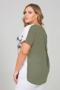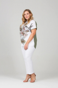 Лёгкая нарядная летняя блуза с коротким цельнокроеным рукавом. Идеальный крой формирует прямой свободный силуэт. Ткань полочки - тонкий эластичный текстиль - декорирован изящным принтом в нежных пастельных тонах. Спинка модели выполнена из однотонного шифона. По центру спинки для комфорта заложена глубокая складка. Изысканная линия выреза «лодочка» и разноуровневая линия нижнего среза спереди и на спинке придают модели простоту и стилевую завершённость.