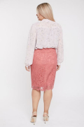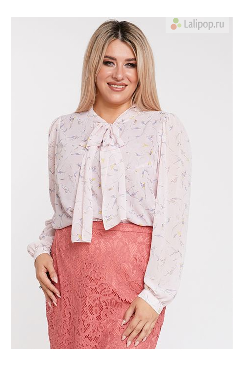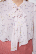 Женственная блуза на подкладке, верх - шифон в нежный принт, нижний слой - однотон. По переду прилегание по груди за счет вытачек, по спинке отрезная кокетка, дополнена мелкой сборкой. Оригинальный воротник-стойка, переходящий в бант, создает эффектный акцент. Втачные длинные рукава со сборкой по окату, низ рукава присборен и дополнен манжетой. Манжеты застегиваются на одну петлю и пуговицу. Бант и низ блузки обработаны закруткой.