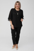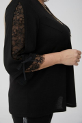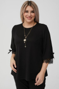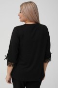 Женственная блуза полуприлегающего силуэта из однотонного трикотажа. Прилегание по груди за счет вытачек. Круглый вырез горловины обработан бейкой. Втачные двойные рукава длиной ¾, с интересным дизайнерским решением. Нижний слой выполнен из сетки и оформлен широким кружевом по центру и низу. Верхний слой рукава из основной ткани с фигурным вырезом по центру, дополненным нежным аксессуаром в виде банта. Низ округлой формы. Прекрасный вариант для создания женственных образов в сочетании с брюками и юбками.