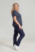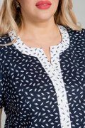 Горловина оформлена широкой обтачкой из ткани - компаньона, переходящей в планку на петли и пуговицы.