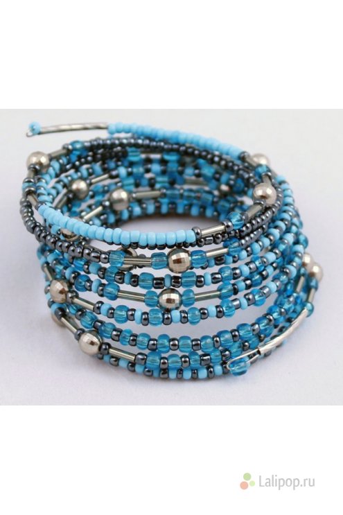 Стильный браслет с неповторимым авторским дизайном! Выполнен из бисера и металла. Граненые металлические шарики придают украшению объемность. Нежные оттенки голубого, глубокого черного и стального добавят образу нежности и изящества. Такой браслет подарит отличное настроение и сможет стать великолепным подарком!
