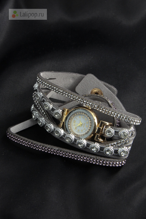 Браслет - часы выполнен из искусственной кожи серого цвета, украшены стразами. Металл золотого цвета.