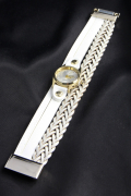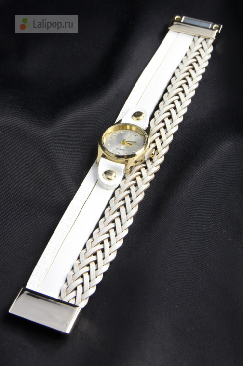 Браслет - часы выполнен из искусственной кожи белого цвета.. Металл золотого цвета.