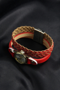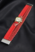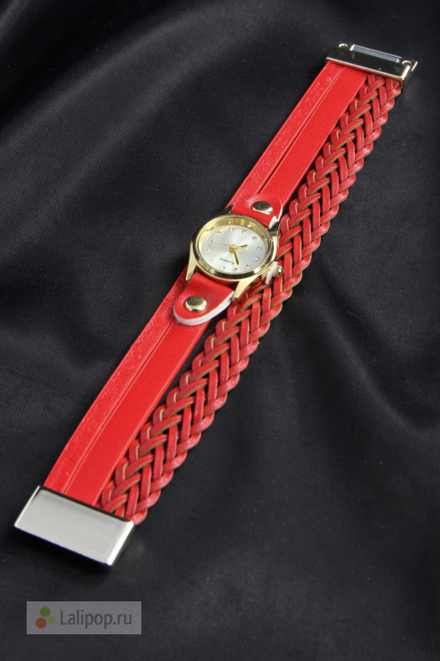 Браслет - часы выполнен из искусственной кожи красного цвета.. Металл золотого цвета.