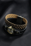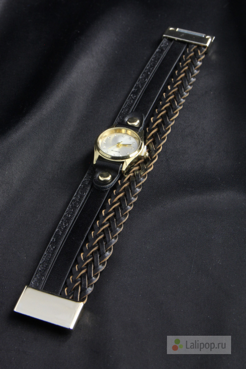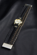 Браслет - часы выполнен из искусственной кожи черный цвета.. Металл золотого цвета.