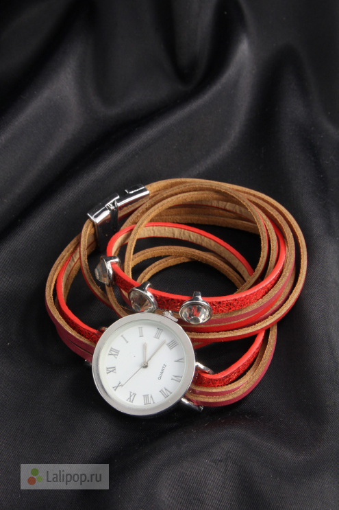 Браслет - часы выполнен из искусственной кожи красного цвета.. Металл серебряного цвета.