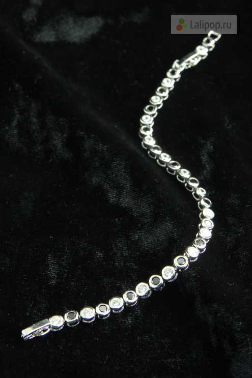 Привлекательный браслет, выполненный из металла цвета серебра, украшенный фианитами черного и прозрачного цвета.