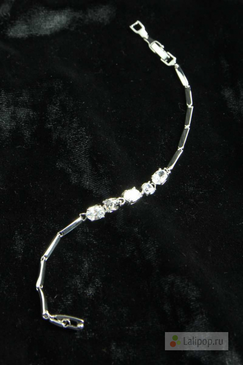 Тонкий изящный браслет, выполненный из металла цвета серебра, украшенный фианитами прозрачного цвета.