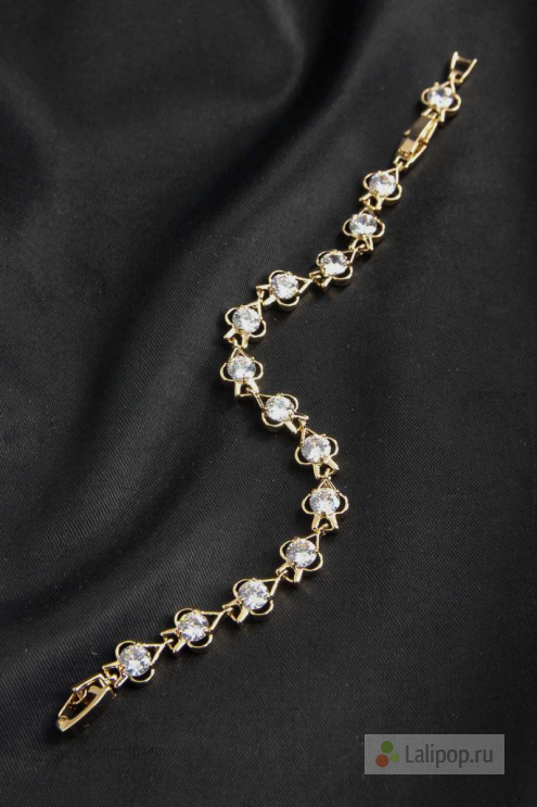 Изящный браслет, выполненный из металла цвета золота. Браслет украшен фианитами прозрачного цвета.