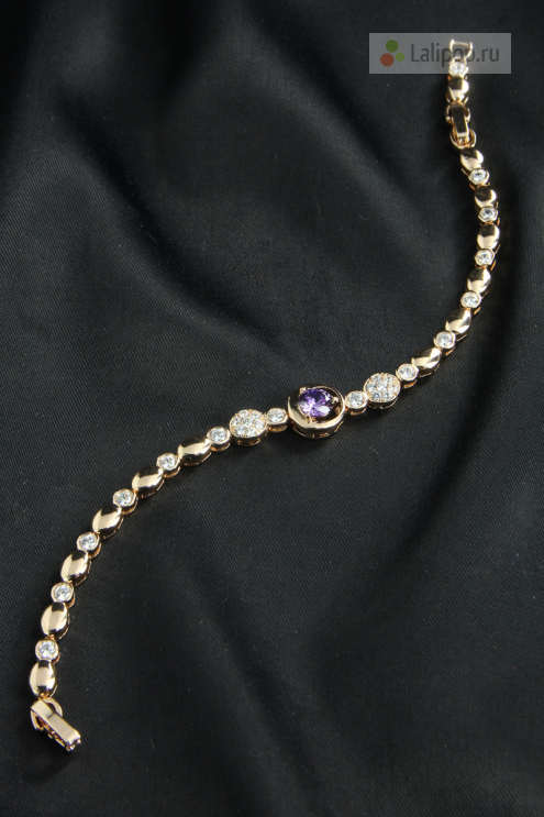 Изящный браслет, выполненный из металла цвета золота. Браслет украшен фианитами прозрачного и фиолетового цвета.