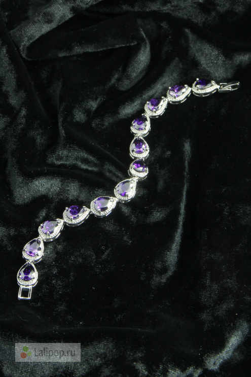 Изящный браслет с крупными камнями в форме капель. Выполнен из металла цвета серебра. Браслет украшен фианитами белого цвета и крупными цирконами фиолетового цвета.