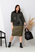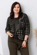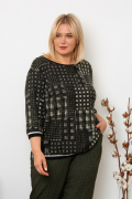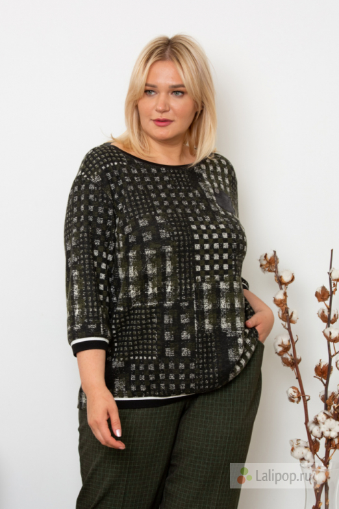 Джемпер с узором "пэчворк", выполнен из легкого поливискозного трикотажа. Модель прямого силуэта, с округлой горловиной. Отрезной рукав длиной 3/4, линия плеча немного спущена. Горловина и нагрудный карман выполнены из мягкого трикотажа с имитацией кожи. Манжеты и низ полочки оформлены контрастной резинкой.