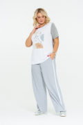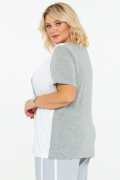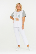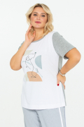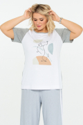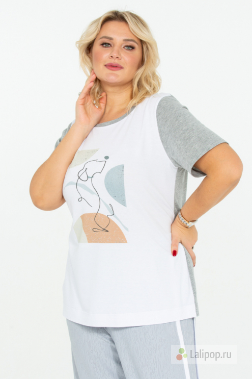 Хлопковая футболка с авторским принтом. Модель прямого силуэта, с коротким отрезным рукавом. Полочка выполнена из однотонного белого хлопка, а рукава и спинка - из серого меланжа. Милый анималистичный принт сочетается с графичной геометрией в пастельных тонах.