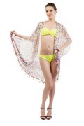 Легкая накидка из хлопковой вуали с ярким принтом. По низу изделия пришита тесьма с кисточками.