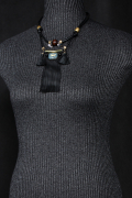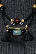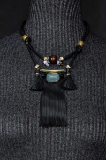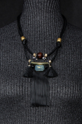 Шнурки, бахрома и кисточки из кожи. Украшают подвес крупный кристалл, деревянная бусина и металлические элементы бронзового цвета.