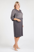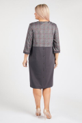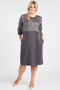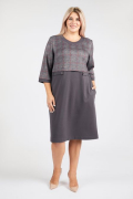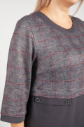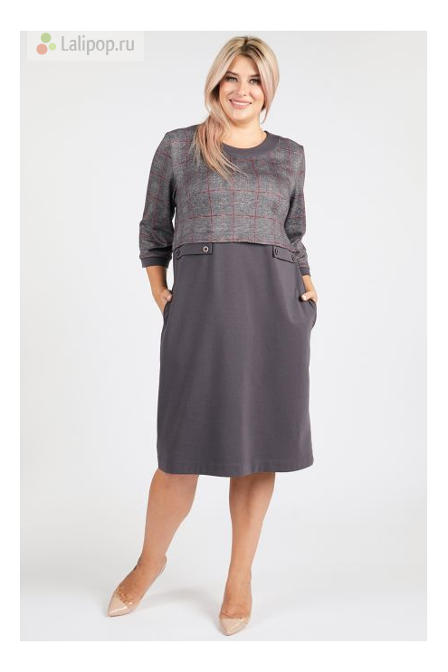 Комфортное платье полуприлегающего силуэта из комбинированных тканей. Лиф и рукава – трикотаж клетка, низ изделия и отделка – однотонный трикотаж «джерси». Лиф отрезной, с завышенной линией талии, прилегание по груди за счет вытачек. Круглый вырез горловины обработан широкой трикотажной обтачкой. Втачные рукава ¾, по низу дополнены манжетой. По переду под лифом декоративный элемент в виде клапанов, в боковых швах удобные карманы. Нижняя часть спинки по центру оформлена имитацией застежки с пуговицами по всей длине. Низ ровный.