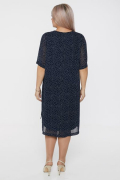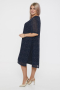 Легкое двойное платье свободного силуэта из шифона в принт "мелкий горох". Нижний слой выполнен из ткани «ниагара». Круглый вырез горловины обработан внутренним швом. Втачные рукава длиной до линии локтя. Прилегание по груди достигнуто за счет вытачек. Слева, в боковом шве верхнего слоя, высокий разрез, дополнен завязками. Низ ровный.