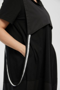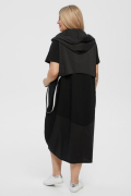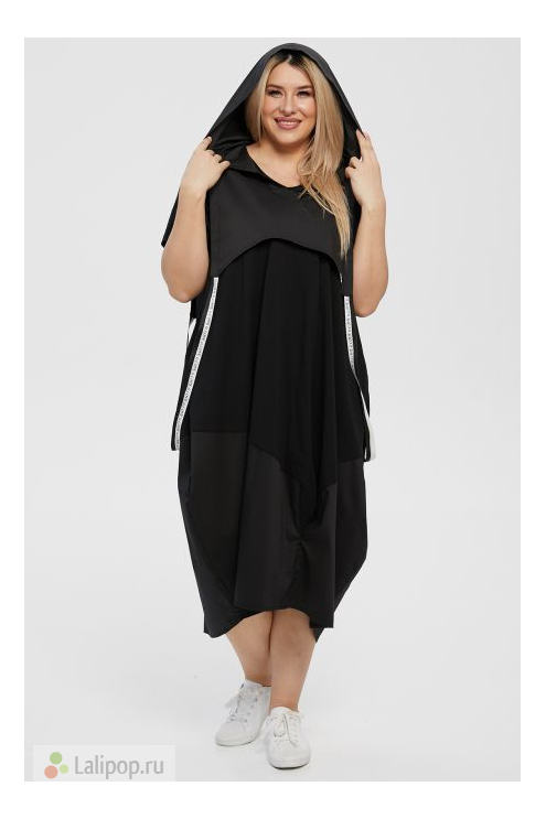 Эффектное платье - баллон из комбинированных тканей. Основа платья и рукава выполнены из хлопкового трикотажа, нижняя часть платья дополнена фигурной деталью из «поплина». V-образный вырез горловины обработан окантовкой. Рукава втачные укороченные. В боковых швах удобные карманы. Платье дополнено верхней съёмной деталью с капюшоном и стильными лямками из декоративной тесьмы. В виде декора слева - пришивное украшение "LUXURY".