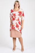 Оригинальное платье свободного силуэта длиной около колена. Модель выполнена из двух видов материалов: нижнее платье из плательной ткани стрейч, верхняя накидка из мягкого шифона яркой расцветки. Горловина обработана внешней обтачкой из однотонной ткани. Нижнее платье-футляр полуприлегающего силуэта с открытыми проймами, обработанными окантовкой. Верхняя накидка с цельнокроенным рукавом свободного силуэта, по низу обработана изящной закруткой. Платье прекрасно скрывает небольшие несовершенства и подчеркивает достоинства фигуры.