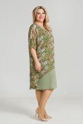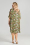 Модель выполнена из двух видов материалов: нижнее платье из плательной ткани стрейч, верхняя накидка из мягкого шифона яркой расцветки.