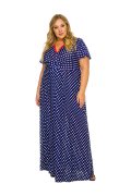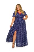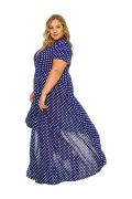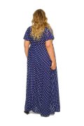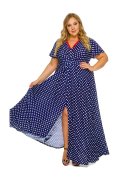 Элегантное длинное вечернее платье из легкого трикотажа "масло" с принтом горох на т.синем фоне. V-образный вырез украшен кружевом, спереди широкой юбки разрез.