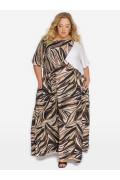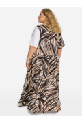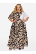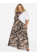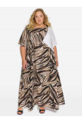 Платье длинное, свободного силуэта, из смесовой ткани, содержащей в составе лен и вискозу. Нижняя часть платья отрезная, присборенная. Линия подреза по переду фигурная, по спинке горизонтальная. Основной цвет мультиколор. Левая часть переда и левый рукав из крепа белого цвета. В боковых швах карманы. Рукав втачной, свободный.