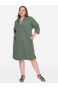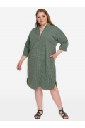 Платье из джерси свободного силуэта в актуальном принте "гленчек" или "гусиная лапка". Плосколежащий воротник выполнен в виде широкой планки, наложенной друг на друга и втачаной в V-образную. горловину, тем самым напоминая кимоно. Боковые швы закругленные в области низа. Перед короче спинки на 6 см. Карманы в боковых швах. Очень удобный свободный рукав, выполненный на основе спущенного. Принт "гленчек" или "гусиная лапка"представляет собой простой двухцветный геометрический узор, сочетающий асимметричные линии и абстрактные многоугольники. Ткань - джерси, состав: 67% полиэстер, 30% вискоза; 3% эластан. Цвет - оливковый. * длина изделия по спинке 110 см перед короче спинки на 6 см.