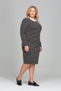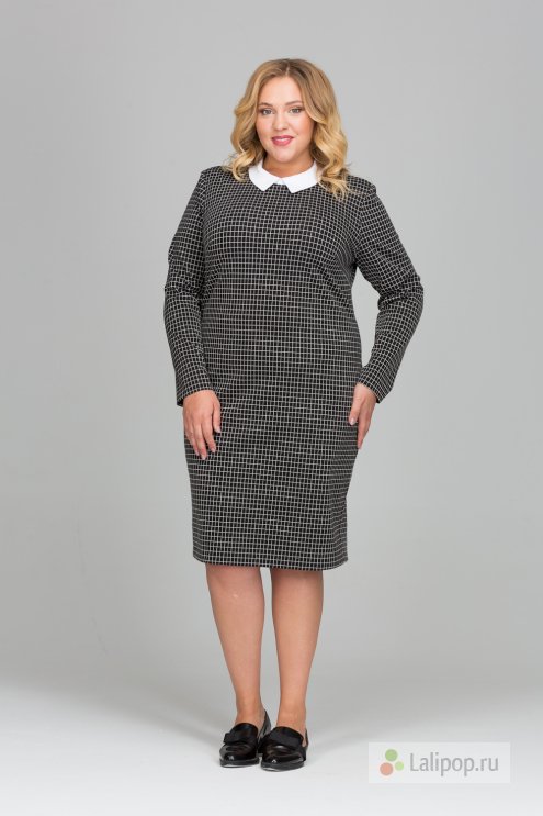 Стильное офисное платье полуприлегающего силуэта, выполнено из жаккардового трикотажа с рисунком деликатная клетка. Модель с белым воротничком, с длинным втачным рукавом. Спинка со средним швом, застежкой на молнию и шлицей.