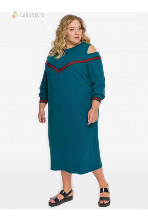 Платье свободное По переду кокетка, выкроенная углом, к нижнему срезу которой притачана отделочная тесьма контрастного цвета. "Поддерживают идею" свободные рукава, также выполненные с отделочной тесьмой на том же уровне, что и на переде платья. Деталь верхней части рукава отсутствует, давая возможность приоткрыть плечо. Рукав длинный, присборенный по низу, на манжете. В левом боковом шве зазрез.
