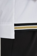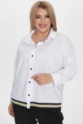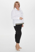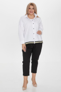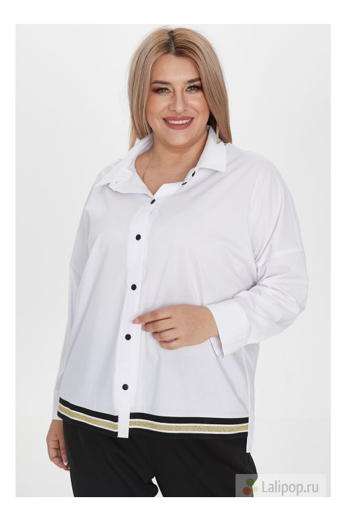 Стильная рубашка прямого силуэта из однотонной сорочечной ткани. Горловина оформлена воротником рубашечного типа. По переду планка по всей длине изделия, с застежкой на петли и пуговицы. Линия плеча спущенная, рукав длинный, по низу дополнен манжетой. Низ разноуровневый, с удлиненной спинкой. Перед по низу оформлен ярким подвязом, по спинке притачная манжета. Прекрасный вариант для создания интересных образов в сочетании с брюками и юбками.