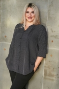 Стильная рубашка свободного силуэта из сорочечной ткани в мелкий горох. По переду планка - поло с застежкой на петли и пуговицы. Прилегание по груди за счет вытачек. Спинка с отрезной кокеткой, переходящей на перед. Фигурный вырез горловины оформлен обтачкой. Рукава длиной 3/4. В виде декоративной отделки по переду, центру спинки и центру рукава - оригинальные мелкие складки. Низ ровный.