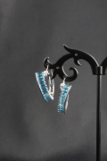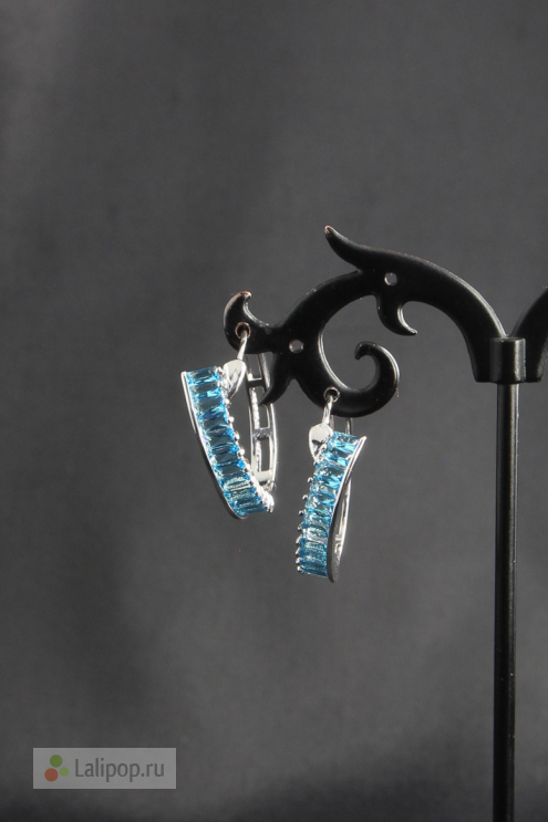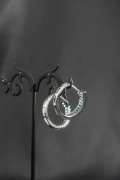 Крупные выразительные серьги - кольца с дорожкой из голубых цирконов в оправе из металла серебрянного цвета.
