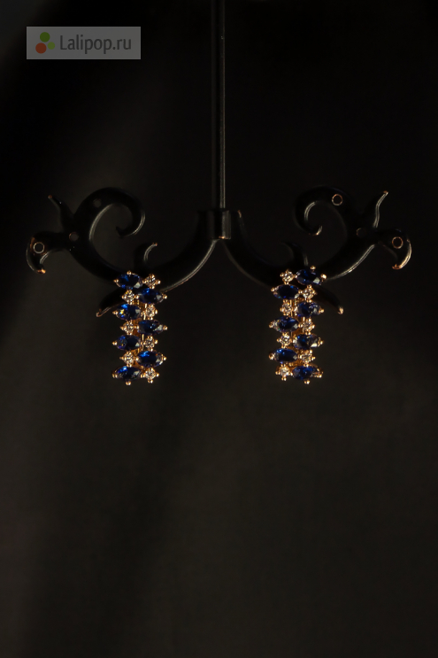 Великолепные серьги, выполненые из ювелирного сплава цвета золота. Серьги украшены фианитами синего и прозрачного цвета.