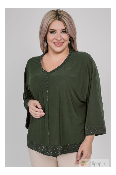 Нарядная модель прямого силуэта, длиной до линии бедер, выполнена из пластичного трикотажа с отделкой. Фигурный вырез горловины обработан бейкой. По переду центральный шов. Цельнокроеный рукав длиной 7/8, по низу оформлен манжетой. В качестве отделки - бейка горловины, кант в среднем шве переда, манжета рукава и пояс по низу изделия, выполнены из отделочной ткани с люрексной нитью, что придает изделию праздничный вид. Низ изделия ровный. Прекрасный вариант для создания эффектных образов в сочетании с брюками и юбками.