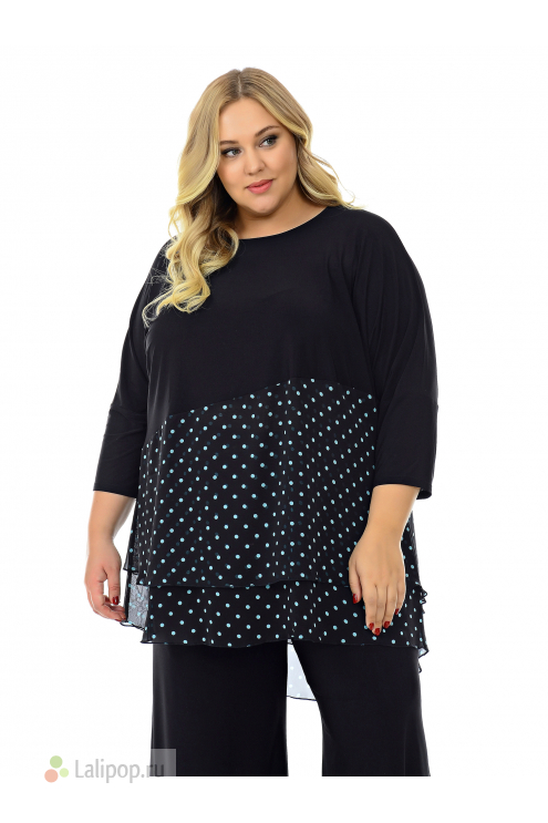 Туника комбинированная, шифон черный в ментоловый горошек * (Мультиколор)