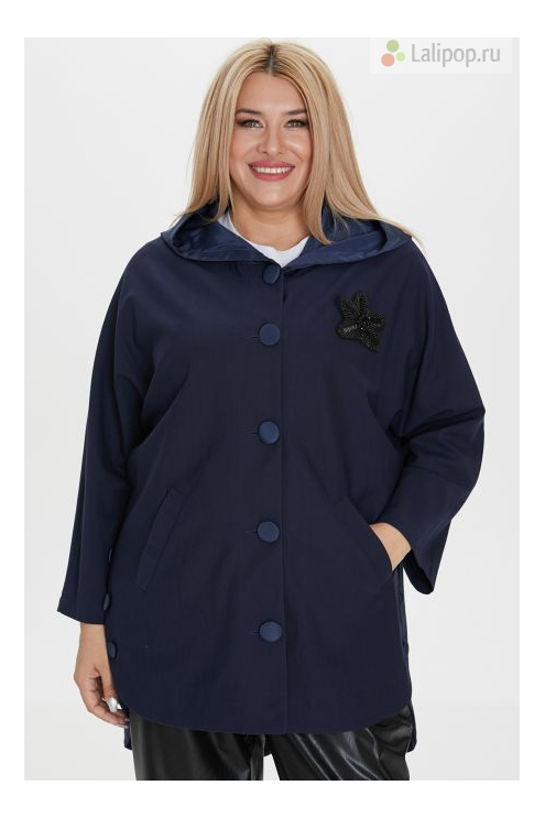 Ветровка прямого силуэта из плотной однотонной трикотажной ткани. Модель без подкладки. Горловина оформлена капюшоном из отделочной плащевой ткани. Перед с центральной застежкой на петли и пуговицы и удобными прорезными наклонными карманами с листочкой. Рукав цельнокроеный длинный. По боковым швам оригинальная шлица с застежкой на 3 петли и пуговицы. Низ фигурный. Слева на груди аксессуар - аппликация в виде бисерного цветка. Прекрасный выбор для создания стильного образа в прохладное время года.